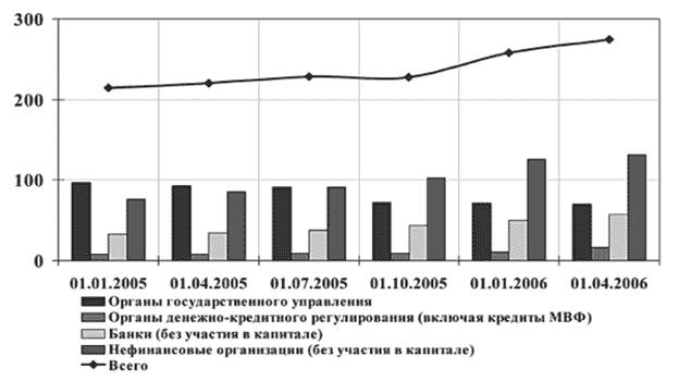 Наблюдавшийся рост задолженности был связан прежде всего с притоком иностранного капитала в частный сектор. Суммарное увеличение иностранных долговых обязательств банков и нефинансовых организаций с января по март 2006 года составило 12,3 млрд. долларов, или 75,6% роста внешнего долга всей экономики.