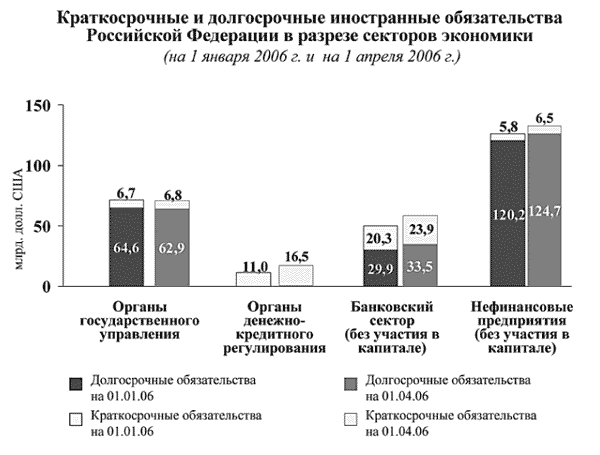Рис. 3. Краткосрочные и долгосрочные иностранные обязательства РФ в разрезе секторов экономики на 1.01.2006г. и на 1.04.2006г.