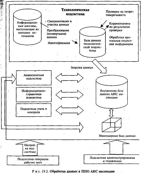 - технологическая подсистема: проводит проверку поступившей информации и обновляет внутреннюю базу данных АИС инспекции;