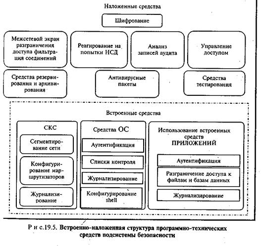 Используемые программно-технические средства подсистемы безопасности представляют встроенно-наложенную структуру.