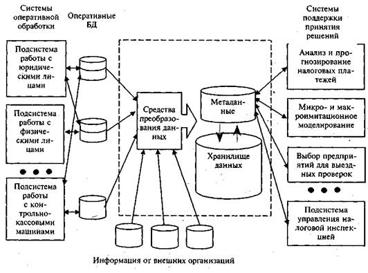 АИС налоговых органов представляет собой совокупность взаимодействующих прикладных подсистем, решающих определенные группы функциональных задач на основе оперативных баз данных и электронного хранилища данных (далее хранилище данных). Общая структура АИС налоговых органов показана на рис. 2.