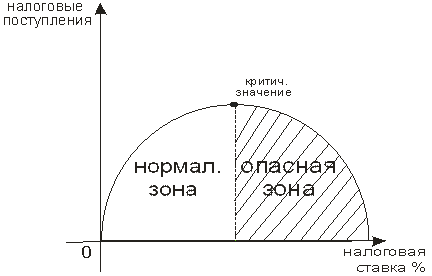 Кривая Лаффера показывает связь между налоговыми ставками и объемом налоговых поступлений, выявляет такую налоговую ставку, при которой налоговые поступления достигают максимума. Кривая дает ответ на вопрос «при какой ставке налогов, налоговые поступления в бюджет максимальны?» При дальнейшем повышении ставки мотивация предпринимательской деятельности ослабевает, падают объемы производства и уменьшаются налоговые отчисления.