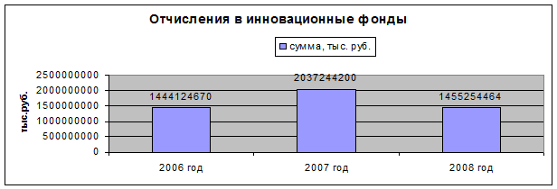 Отчисления в инновационные фонды в 2006г. составили 1 444 124 670 тысяч рублей (8,84 процента от общей суммы налоговых поступлений). За 2007г. отчисления в инновационные фонды увеличились на 593 119 530 тысяч рублей и составили 2 037 244 200 тысяч рублей или 10,41 процента от общей суммы налоговых поступлений. В 2008г. прогнозируется снижение суммы данных отчислений на 581 989 736 тысяч рублей и составит 1 455 254 464 тысячи рублей или 5,9 процентов (диагр. 2.1)