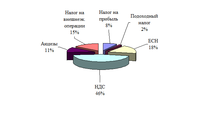 Структура поступлений налогов и сборов в федеральный бюджет по видам налогов за 2003 год. [2, с. 102]