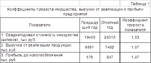 На первом этапе выполнения аналитической части работы рассмотрим коэффициенты прироста имущества, выручки и от реализации и прибыли предприятия за период 2003-2004 гг., являющихся налогооблагаемой базой для основных налогов предприятия: налога на имущество, НДС и налога на прибыль.