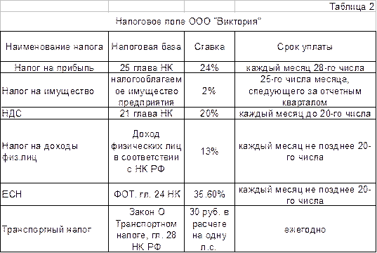 Для того, чтобы проанализировать налоговое поле предприятия, составим таблицу 2, в которой отразим такие данные по налогам как: