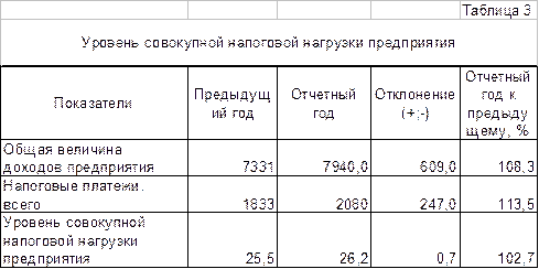 Данные таблицы 3 позволяют оценить влияние общей величины доходов предприятия и суммы налоговых платежей на уровень совокупной налоговой нагрузки. Так, учитывая, что темп роста доходов составил 108,3 %, а темп роста налоговых платежей – 113,5 %, можно сделать вывод о том, что причиной уменьшения налоговой нагрузки стал менее быстрый рост общих доходов предприятия в сравнении с резким ростом размера налоговых платежей.