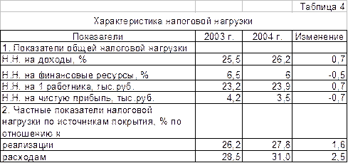 Анализируя представленные в таблице 3 данные, следует отметить что за анализируемый период уровень налоговой нагрузки на наше предприятие имел тенденцию к росту и составил в 2004 г. 26,2 %, что на 0,7 % больше аналогичного показателя в 2003 г.