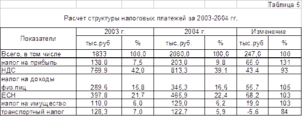 Анализируя данные, представленные в таблице 5, можно сделать вывод о том, что на протяжении последних двух лет в ООО «Цитадель» наибольший удельный вес в структуре налоговых платежей приходился на НДС (более 39,1 % в 2004 г.).