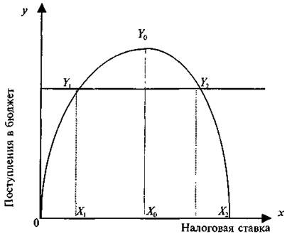 х — налоговая ставка (в % от налогооблагаемой базы); у — среднегодовой объем налоговых поступлений в бюджет; ч Х0 — оптимальная ставка налога, при которой поступления в бюджет достигают максимума — У0.