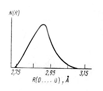 (валентных частот О – Н связи) от О – О расстояния, распределение длин О – О в жидкой воде имеет вид, представленный на рис.2. Распределение расстояний О – О в воде оказывается очень широким. Максимум имеет место при 2,86 Å, однако распределение длин связи простирается от 2,75 Å до величин, равных 3,05 Å.