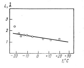 На основании данных по сравнению частот либрационных колебаний молекул Н2О во льду I и в воде можно предположить, что частоты внутримолекулярных и межмолекулярных переходов протонов одинаковы в воде и равны 1000 см-1 Из данных по рассеянию нейтронов Тейхейра и др. (1984) следует, что протон в жидкой воде в диапазоне температур от +20 до -20°С диффундирует скачками. Длина скачка практически не зависит от температуры и равна 1,6 Å (рис.5). Это расстояние равно расстоянию протонов внутри молекулы Н2О, что свидетельствует в пользу развиваемой нами концепции.