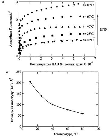 Адсорбция ионных ПАВ на гидрофильных поверхностях практически не зависит от температуры, как это видно из рис.10, б. Адсорбция изменяется всего на 10-20% при изменении температуры на 50°С. Максимум адсорбции наблюдается при 25 °С, что совпадает с минимальным значением KKM поверхностно-активного вещества при этой же температуре.