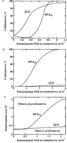 Из рисунков видно, что ДСН обеспечивает хорошую устойчивость к механическому воздействию, но его адсорбция на частицах латекса не приводит к стабилизации по отношению к действию электролита и циклам замораживание - оттаивание. В то же время адсорбция неионного ПАВ на поверхности частиц латекса обеспечивает высокую устойчивость латекса по отношению ко всем трем типам воздействия. Например, механическая устойчивость достигается при поверхностной концентрации выше - 0.6-0.8 мг/м2. Это значение соответствует монослою НПАВ, в котором молекулы лежат плоско на поверхности. При повышении поверхностной концентрации полиоксиэтиленовые цепи начинают выходить в водный раствор, что обеспечивает повышение устойчивости к коагуляции, вызываемой механическим перемешиванием. Устойчивость к циклам замораживание-размораживание достигается лишь при поверхностной концентрации выше ~2-2.5 мг/м2, что соответствует полностью заполненному монослою НПАВ, в котором молекулы ПАВ образуют "частокол", т.е. их углеводородные цепи контактируют с поверхностью, а полиоксиэтиленовые цепи направлены в раствор.