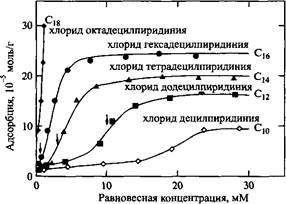Рис. 9. Адсорбция некоторых катионных ПАВ на кремнеземе при рН 4. Кооперативность адсорбции возрастает с увеличением длины алкильных цепей