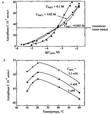 Рис.10. а - Адсорбция хлорида додецилпиридиния на каолине при трех различных значениях ионной силы, б - температурная зависимость адсорбции при трех концентрациях ДПХ выше изоэлектрической точки. С разрешения