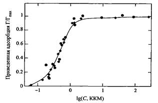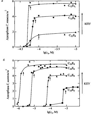 На рис.12, а, б представлены изотермы адсорбции ряда неионных ПАВ типа CmEn на кремнеземе. Прежде всего видно, что адсорбция резко увеличивается задолго до KKM. Кроме того, отметим, что на изотермах адсорбции наблюдаются плато при концентрациях, близких к KKM НПАВ. Наконец, обратим внимание, что ступенчатый характер изотерм, указывающий на высокую кооперативность, особенно ярко проявляется в случае НПАВ с низким содержанием полиоксиэтиленовых фрогментов. Результаты, приведенные на рис.12, отчетливо указывают на то, что НПАВ образуют на поверхности дискретные структуры, аналогичные мицеллам. Размер таких агрегатов увеличивается с увеличением длины углеводородной цепи в молекулах НПАВ.