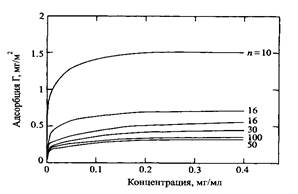 Рис. Адсорбция НПАВ на каолине при различной длине полиоксиэтиленовых цепей. При увеличении з увеличивается КПУ, что приводит к уменьшению адсорбции