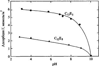 Рис.15. Адсорбция двух неионных ПАВ на кремнеземе в зависимости от рН.