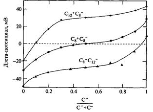 Рис.16. Дзета-потенциал латексных частиц в присутствии смеси анионного и катионного ПАВ с углеводородными радикалами различной длины.