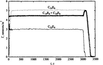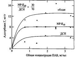 Рассмотрим конкуренцию двух НПАВ за центры адсорбции на поверхности. Конечно, более гидрофобное НПАВ должно доминировать в адсорбционном слое вследствие его более низкой растворимости в водной фазе. Выше уже обсуждалась одновременная адсорбция на гидрофобной поверхности двух НПАВ. Напомним, что более гидрофобное НПАВ преимущественно адсорбируется на поверхности, а более гидрофильное предпочтительно остается в водной фазе.