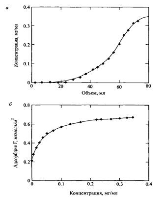 Раствор ПАВ медленно пропускается через ячейку, и на выходе из нее измеряется концентрация ПАВ. Схематически такая ячейка представлена на рис.2. На рис.3, а и б показаны соответственно концентрационный профиль ПАВ и изотерма адсорбции. Существенными параметрами в этом методе являются скорость протекания раствора через ячейку и скорость перемешивания.
