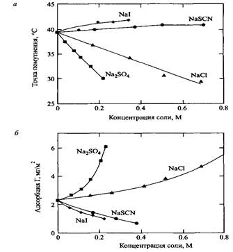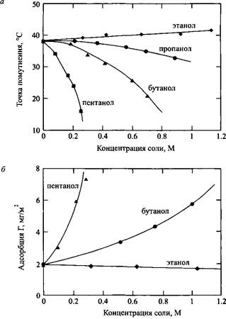 Рис. 4. а - Зависимость точки помутнения водных растворов эталцеллюлозы от концентрации соли; б - адсорбция ЭГЭЦ из тех же растворов на поверхности кремнезема. Данные показывают, что адсорбция увеличивается по мере уменьшения растворимости ЭГЭЦ
