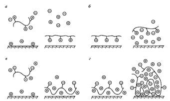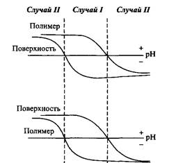 Адсорбцию полиэлектролитов на поверхности твердых тел можно разделить на три типа. Здесь показаны зависимости заряда поверхности и полиэлектролита от рН. Общая закономерность такова, что заряд положителен при низких значениях рН и отрицателен при высоких значениях рН. Конечно, кривые могут также стремиться к нулевому заряду либо в кислой области рН, либо в щелочной. На рисунке показаны различные области, когда полиэлектролит и поверхность несут противоположные заряды или заряжены одноименно.