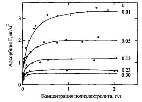 На рис.8 представлена адсорбция катионного полимера на монтмориллоните. Видно, что как только поверхность становится нейтральной, дальнейшая адсорбция прекращается из-за взаимного отталкивания цепей. Максимальная адсорбция отвечает электронейтральной цепи. Этот пример показывает, как электростатические взаимодействия приводят к уменьшению адсорбции, несмотря на то, что полимер и поверхность заряжены разноименно. Очевидно, что адсорбция полиэлектролита зависит также от рН раствора, что определяется зависимостями от рН зарядов поверхности или полиэлектролита. Рисунок 9 иллюстрирует такую ситуацию на примере адсорбции белка: при увеличении рН от изоточки отрицательный заряд белка становится все большим по абсолютной величине. Увеличение плотности заряда поверхности обычно приводит к увеличению адсорбции, поскольку система стремится к электронейтральности. Однако во многих случаях процесс адсорбции контролируется не электростатическими силами, что проявляется при адсорбции отрицательно заряженных цепей на отрицательно заряженных поверхностях. Из рисунка 11 видно, что при введении соли адсорбция увеличивается по мере усиления экранирования и уменьшения отталкивания между цепями при высоких концентрациях соли. Иногда при адсорбции анионного полимера на положительно заряженной поверхности может происходить изменение знака заряда поверхности. Такой пример показан на рис.12 для адсорбции поли на частицах полистирола.