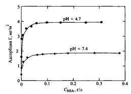 Рис.9. Изотермы адсорбции сывороточного альбумина человека на поверхности отрицательно заряженных частиц золя AgI; концентрация соли 10 мМ; T= 295 К