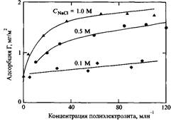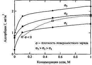 Рис.10. Зависимость адсорбции полистиролсульфоната на положительно заряженных поверхностях с различной плотностью заряда от концентрации соли в растворе