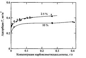 Рис.13. Изотермы адсорбции карбоксиметилцеллюлозы на каолине. Адсорбция из водных растворов, содержащих 0.0033 M CaCl2, при двух разных содержаниях твердого адсорбента