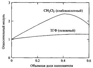 Рис.28. Зависимости относительного модуля упругости ПММА от объемной доли наполнителя для различных образцов пластика, приготовленных из метиленхлорида и тетрагидрофурана