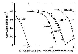 Различные вытеснители характеризуются следующими значениями адсорбционной активности: 4300 - NMP, 44 - Н-этилморфолин, 5.3 - пиридин, 3.5 - Н-этилпирролидон, 2.8 - ДМСО. Таким образом, чем сильнее адсорбируется вытеснитель, тем меньше его нужно добавить для полного удаления полимера с поверхности.