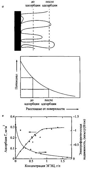 Такие измерения выполняются быстро и служат характеристикой взаимодействия полимера с поверхностью частицы. Адсорбцию ионных полимеров на поверхности частиц также можно определять по электрофоретической подвижности при соблюдении некоторой осторожности, поскольку результаты не всегда оказываются однозначными.