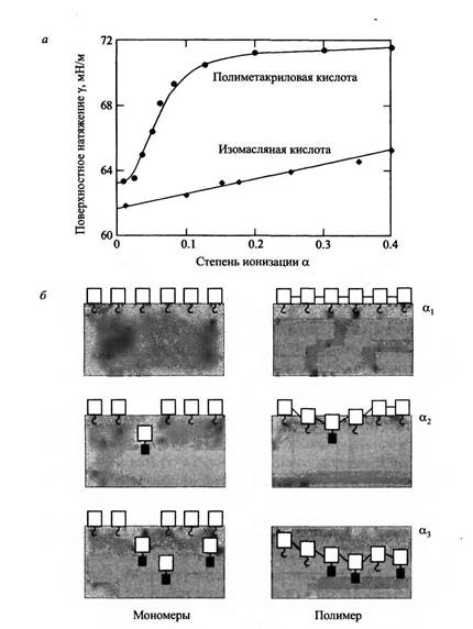 Из рис.16, а видно, что поверхностное натяжение растворов изомасляной кислоты линейно увеличивается со степенью ионизации. Для раствора полимера наблюдается скачок поверхностного натяжения при степени ионизации - 0.1. Причина скачка заключается в полимерной природе поверхностно-активного компонента. При повышении степени ионизации отдельные сегменты адсорбированного полимера ионизуются, но при этом остается еще довольно много неионизованных сегментов, удерживающих полимер в адсорбированном состоянии. При критической степени ионизации полимер полностью десорбируется с поверхности, вызывая скачок поверхностного натяжения. Для наглядности здесь можно провести аналогию с пробками, плавающими на поверхности. Процесс диссоциации моделируется подвешиванием к пробке гирек, втягивающих ее внутрь жидкости. В том случае, если пробки связаны веревкой, они все останутся на поверхности вплоть до достижения критической массы, после чего поверхность сразу освобождается от пробок.