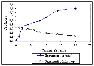 На рис. 3 приведены данные по влиянию добавок глины на насыпную и кажущуюся плотность катализатора. В интервале концентраций глины от 1 до 20 % насыпная плотность катализатора увеличивается незначительно, от 0,5 до 0,6 г/см3. Кажущаяся плотность, которая косвенно характеризует пористость катализатора, в том же интервале концентраций глины увеличивается от 0,8 до 1,0 г/см3.
