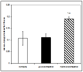 Рис. 2. Активность АПФ у онкологических больных при химиотерапевтическом воздействии (нмоль продукта, образовавшегося за 1 мин инкубации на 1 мг белка, M±m, n=12¸18; достоверность отличий: * - p< 0,05 относительно контроля; ++ - p< 0,01 относительно до химиотерапии).