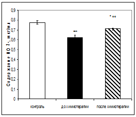 Рис.3 Содержание NO2- в сыворотке крови онкологических больных при химиотерапевтическом воздействии (мкг/мл, достоверность отличий: *- p<0,05 относительно контроля; *** - p<0,001 относительно контроля; ++ - p< 0,01 относительно до химиотерапии).
