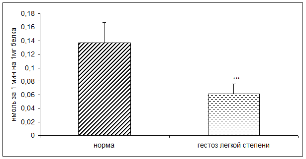 Рисунок 2. Активность ФМСФ-КП в норме и при ОПГ-гестозе легкой степени тяжести (нмоль продукта, образовавшегося за 1мин инкубации на 1мг белка; M±m; *** - p<0,001 относительно нормы)