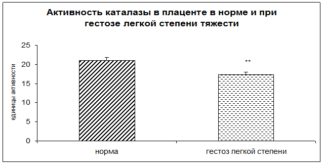 Рисунок 3. Активность каталазы в норме и при ОПГ-гестозе легкой степени тяжести в плацентарной ткани (** - p<0,01 относительно нормы).