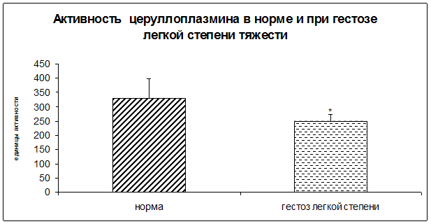 Рисунок 4. Активность церулоплазмина в норме и при ОПГ-гестозе легкой степени тяжести в плацентарной ткани (* - p<0,05 относительно нормы).