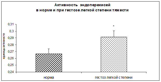 Рисунок 5. Концентрация гидроперекисей в норме и при ОПГ-гестозе легкой степени тяжести в плацентарной ткани (*-p<0,05 относительно нормы).
