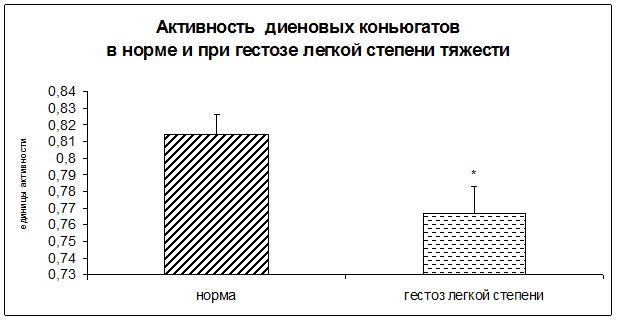 Рисунок 6. Активность диеновых коньюгатов в норме и при ОПГ-гестозе легкой степени тяжести в плацентарной ткани (*-p<0,05 относительно нормы).