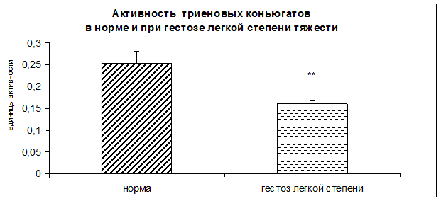 Рисунок 7. Активность триеновых коньюгатов в норме и при ОПГ-гестозе легкой степени тяжести в плацентарной ткани (*-p<0,01 относительно нормы).