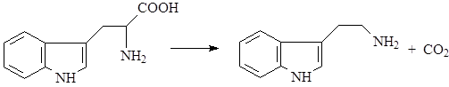 Дальнейшие превращения триптофана могут идти по нескольким путям. В большинстве случаев первой реакцией является его декарбоксилирование с образованием биогенного амина – триптамина (1):