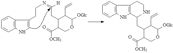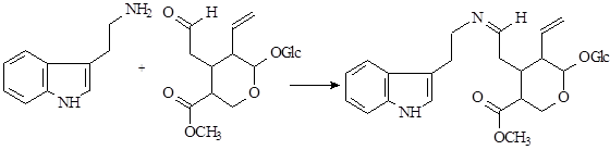 Наиболее интересен биосинтез терпеноидных алкалоидов. Он заключается в конденсации триптамина с циклическим иридоидным альдегидом – секологанином:
