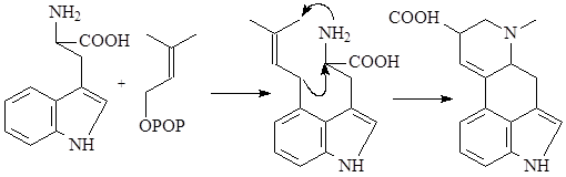 Особое место в биосинтезе индольных алкалоидов занимает биосинтез эрголиновых алкалоидов. В первую очередь он отличается от всех остальных путей тем, что в метаболизм включается непосредственно аминокислота триптофан, а не триптамин. Вначале, в результате взаимодействия триптофана и структурной единицы терпенов - диметилаллилпирофософата образуется 4-диметилаллилтриптофан, который в дальнейшем претерпевает последовательное замыкание двух связей и декарбоксилирование. После окисления боковой метильной группы образуется лизергиновая кислота, которая, соединяясь с рядом аминокислот, образует уникальную группу пептидных алкалоидов, встречающихся только в склероциях спорыньи – Claviceps purpurea (Fries) Tulasne (11):