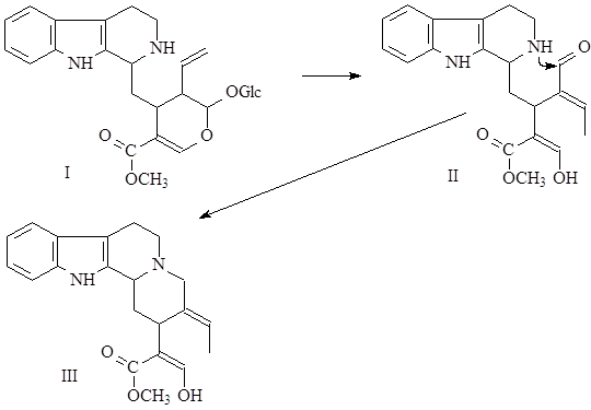 На первой стадии происходит разрыв пиранового кольца (II), с отщеплением глюкозы, и последующим образованием центрального метаболита целого ряда алкалоидов – гизосхизина (III) (19).