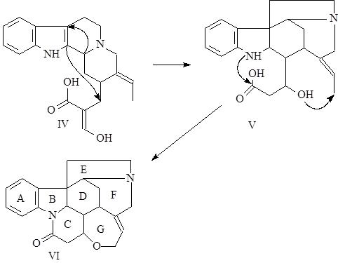 Затем происходит многоступенчатая перегруппировка по типу преакуаммицина, в результате которой получается С21-аналог преакуаммицина (V), и далее, после замыкания лактамного (С) и оксепинового (G) циклов образуется стрихнин (VI) (21),(22).